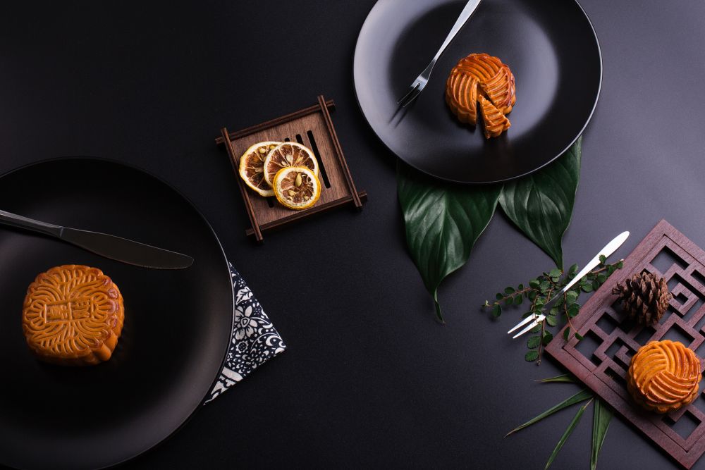 中秋月饼摆拍黑色背景图片
