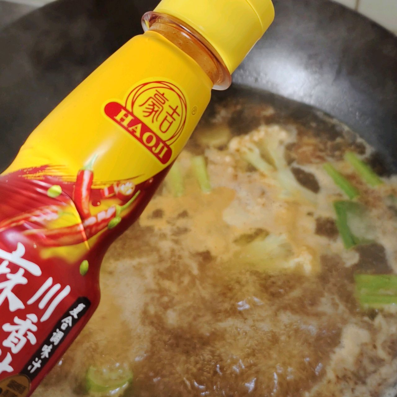 倒开水,倒豪吉麻辣川香汁 放蔬菜煮熟后捞出备用