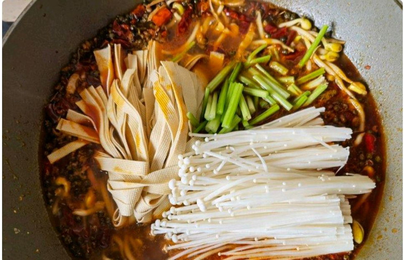 调料:大蒜生姜6g 豆瓣酱2勺 火锅底料一块 干辣椒适量 生抽一勺 蚝油一勺 糖适量 金针菇适量 鸡粉适量 盐适量 干花椒3g 青花椒2g 辣椒面适量