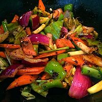 锅中留油,油热加入豆瓣酱快速炒出红油,加入青蒜,青椒,胡萝卜,洋葱翻炒至八成熟,加入五花肉继续翻炒