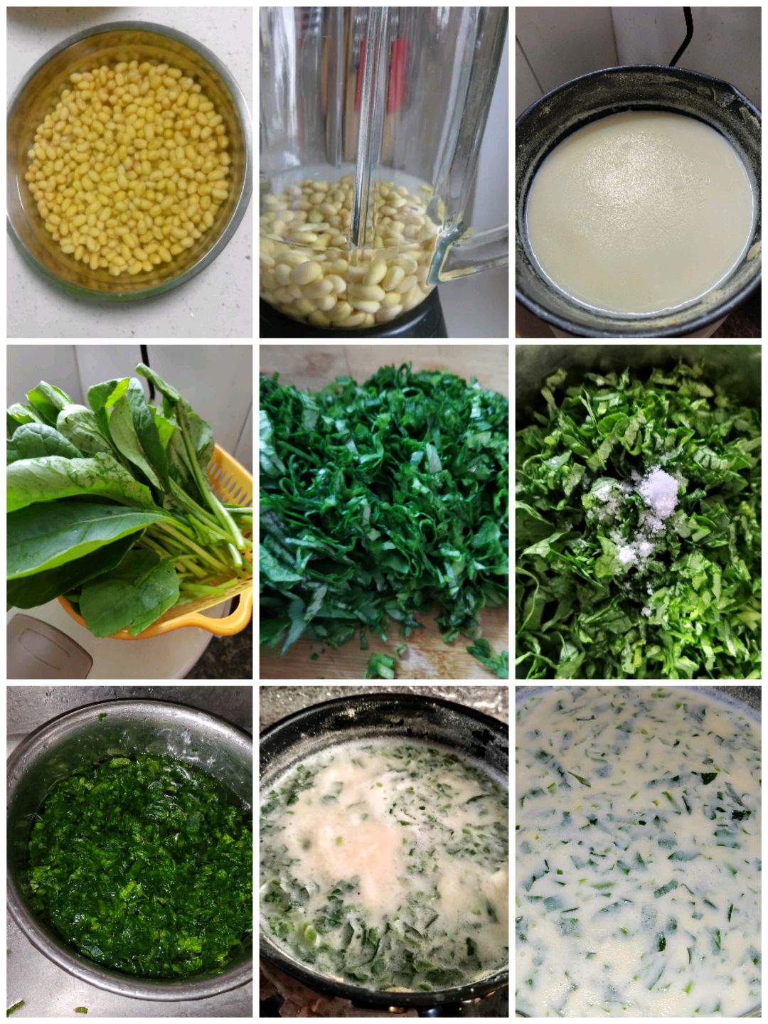 按以上图片步骤横向操作: 1.干黄豆泡制四小时或是一夜; 2.泡好的豆子清洗干净,用豆浆机打好,不用过滤渣, 3.打好的豆浆倒入小锅中,中小火煮开后备用; 4.萝卜菜用清水清洗干净,晾干水分; 5.切碎,尽量切细一点; 6.菜中放入适量的盐,抓匀腌制20分钟; 7.腌好的青菜,用清水清洗两遍,拧干水分备用; 8.再次煮开豆浆,加入拧干水分的青菜,一起煮开关火,放入少量的盐调味; 9.出锅即可。