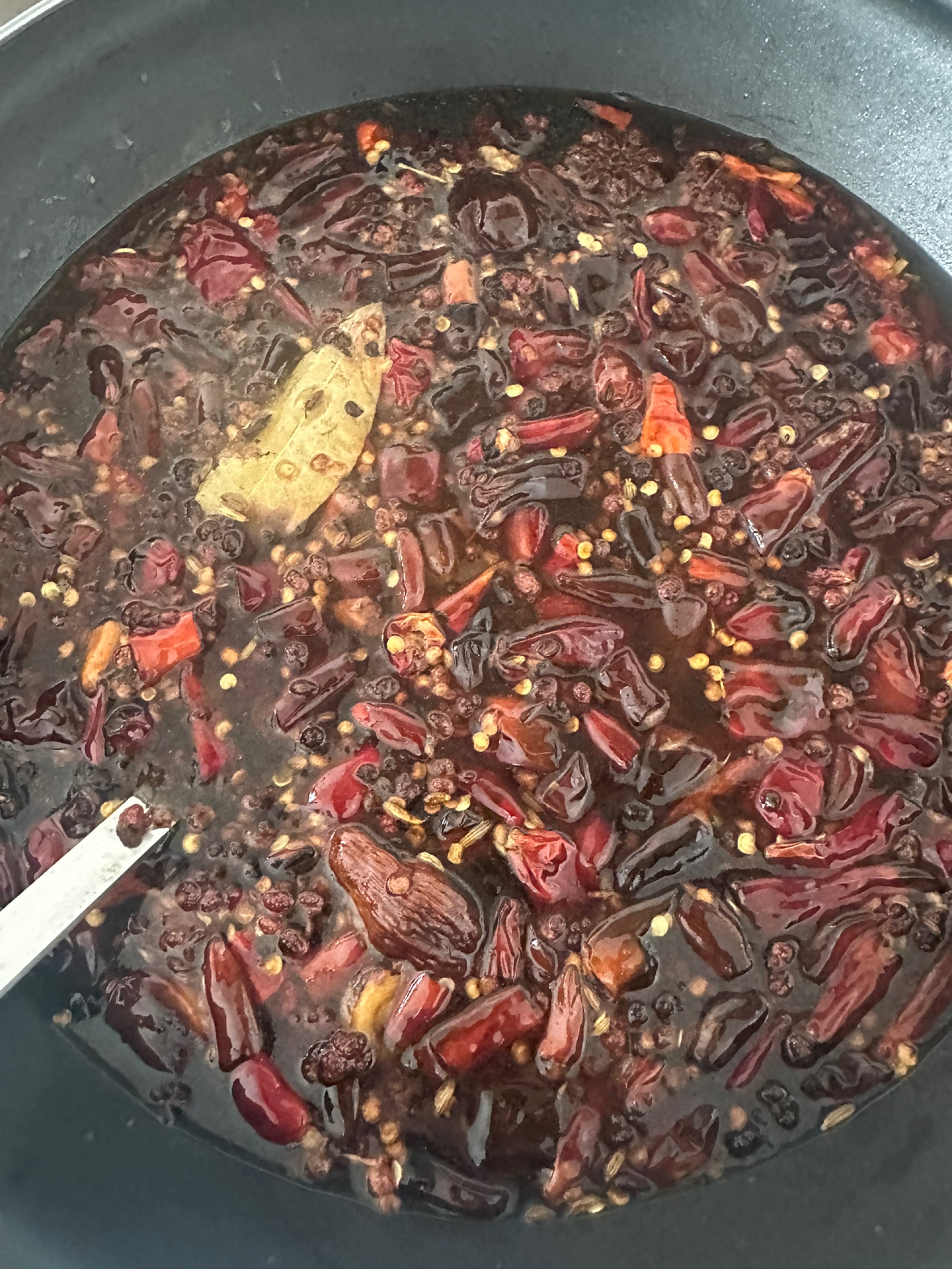 配料:辣椒两大把 孜然2勺 麻椒20粒 香叶2片 桂皮2块 白芷3块 草果2个 豆蔻2个 小茴香1勺 八角2个