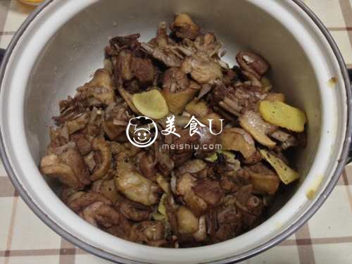板栗煮水约5分钟,然后放凉了拨壳去皮备用。锅中倒入少许色拉油,将生姜放入其中倒入切好的鸭块翻炒,当看到出来很多油,闻到香味即可关火;
