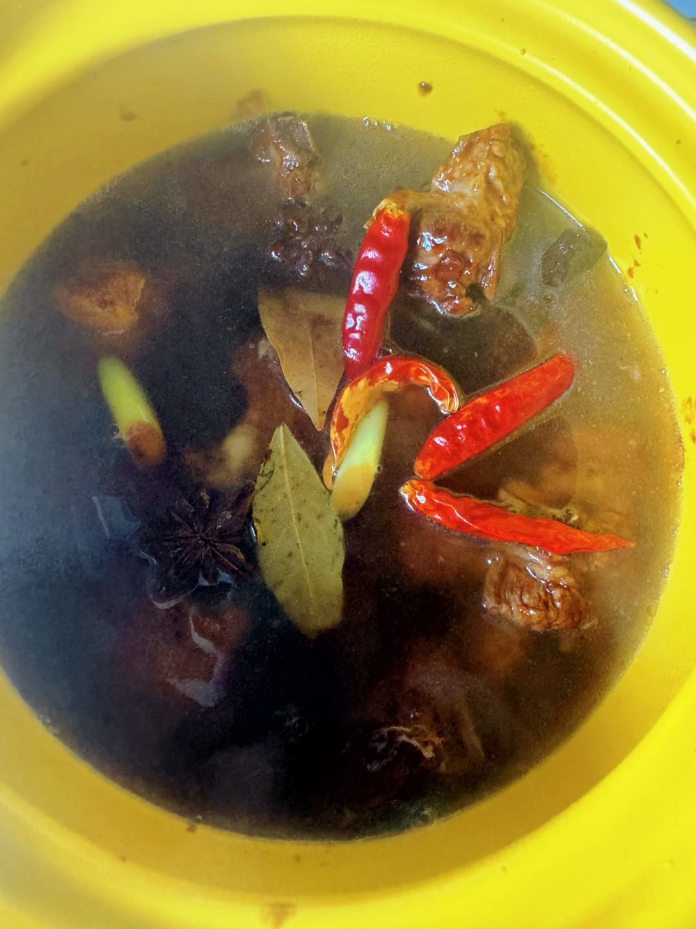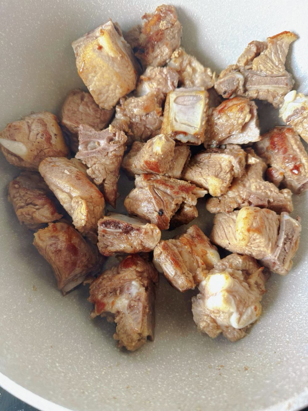 炒好的排骨倒入砂锅中,加入没过排骨的热水,放入几颗冰糖和干椒,烧开后调小火盖上盖子炖煮30分钟;