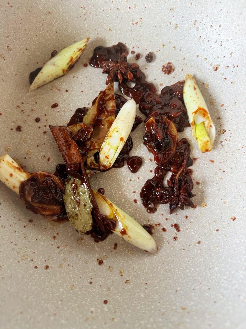 热锅凉油,放入八角、香叶、桂皮、葱姜、一勺黄豆酱炒出酱香味;