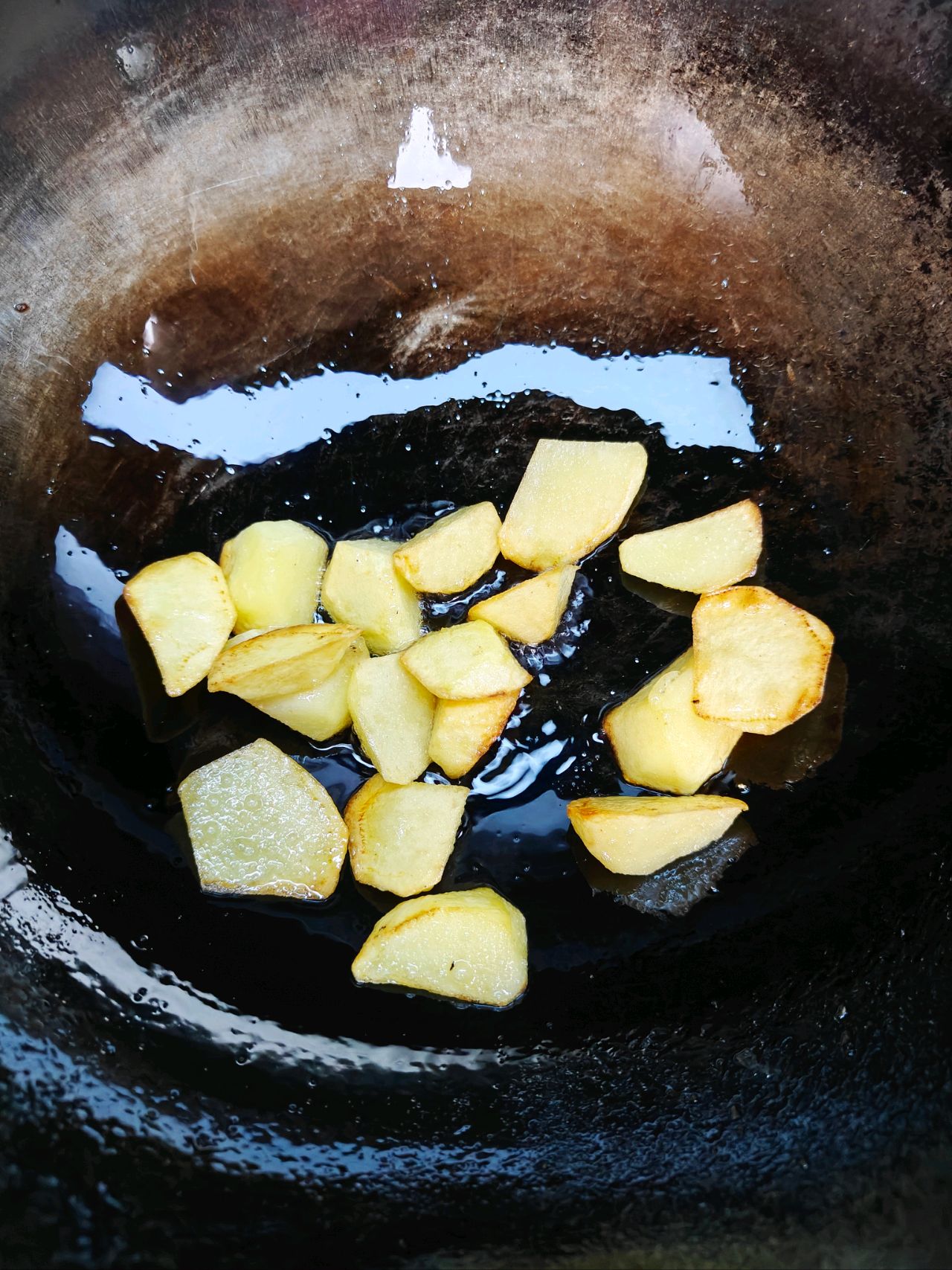 土豆去皮切滚刀块用水清洗一下去除表面淀粉,沥干水分,炸至表面金黄