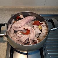 加稍微量多一点的水,煮开后再加入料酒、冰糖、陈皮、白胡椒粉,然后加盖焖煮约40分钟。如果希望猪大肠更快的软烂,可以调一点香醋,红烧各种菜品都可以沿用这个方法。