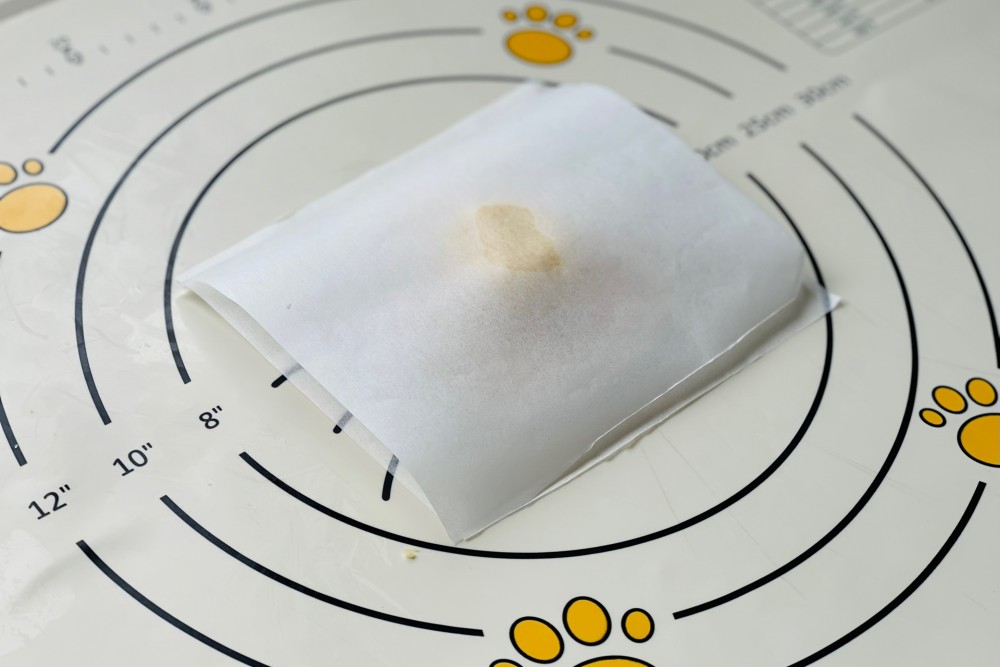 面团醒发好后,把酥皮从冰箱中取出来。将一份酥皮面团放在一块油纸上