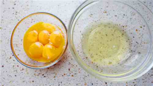 将鸡蛋分离在两个无水无油的干净碗里。