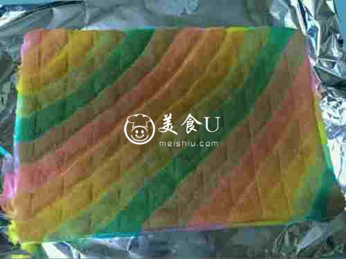 从厚的一边开始卷起来,放入冰箱冷藏一小时,(如果天气热的话建议将冷藏时间延长,切出来比较好看)
