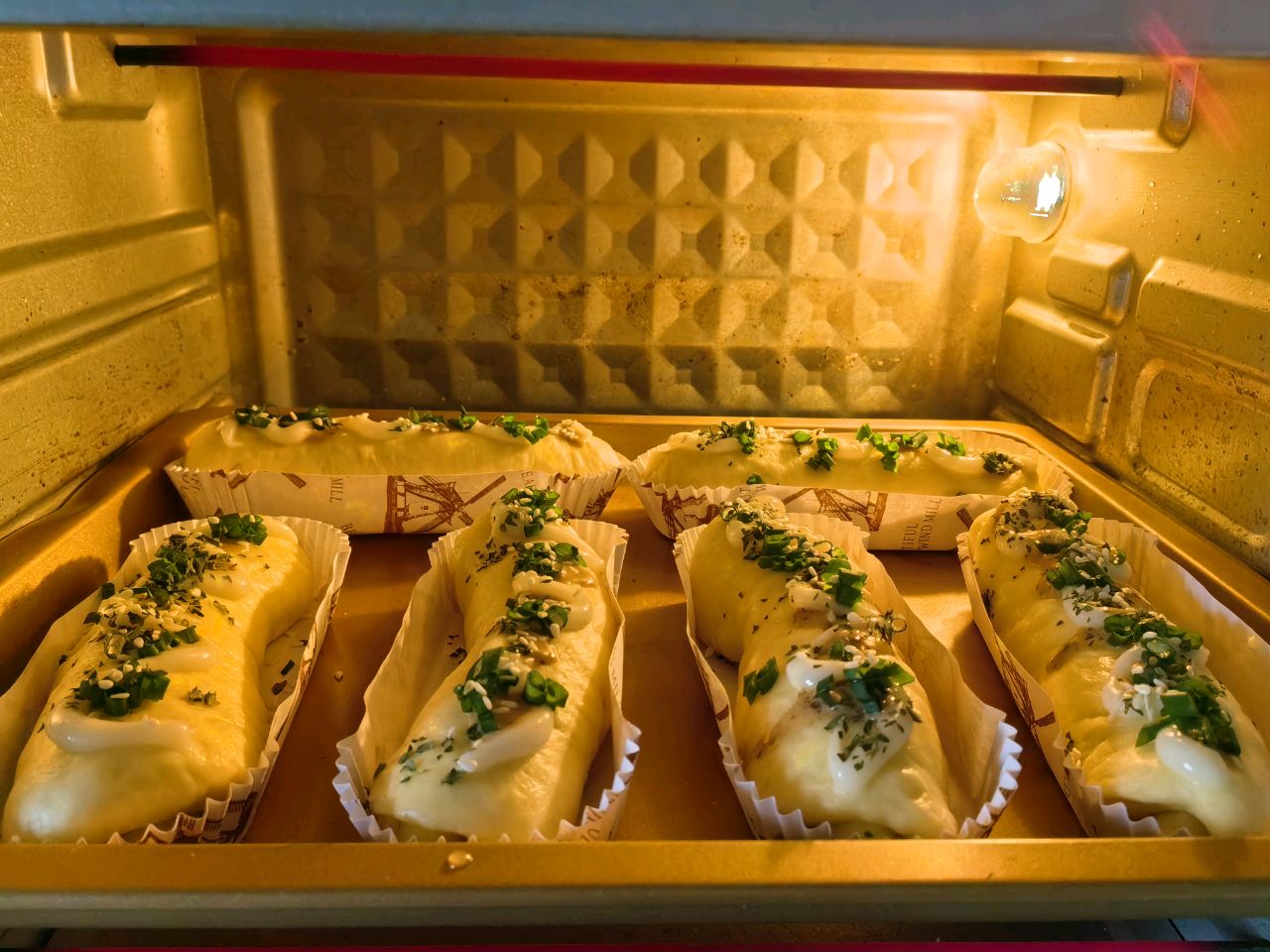 20多度的情况下,室温发酵一小时,面包胚是原来的两倍大。挤上家里有的沙拉酱,然后撒上葱花,我有西芹碎也撒了一点,之后再撒上白芝麻。