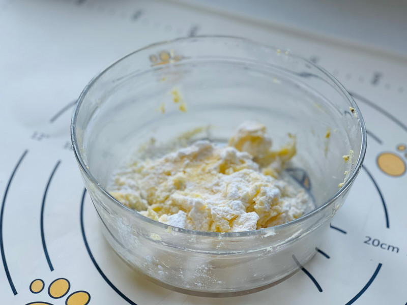 墨西哥酱的做法,先把黄油(提前软化)和糖粉搅拌均匀成团。