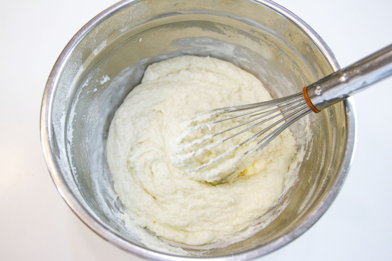 混合面糊:先取三分之一的蛋白霜加入到蛋黄糊中切拌均匀