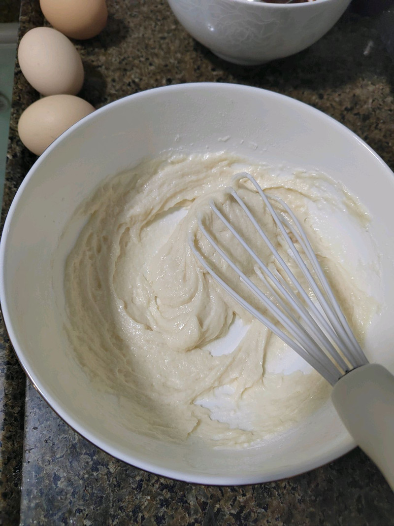 鸡蛋蛋清蛋黄分离,蛋黄加入面糊中拌匀