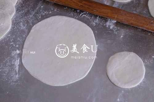 用擀面杖擀成饺子皮大小。