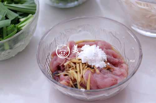 用姜丝、腌料腌制猪肉片刻。