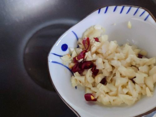 大蒜去皮洗净之后切成末,干红辣椒去蒂洗净切碎