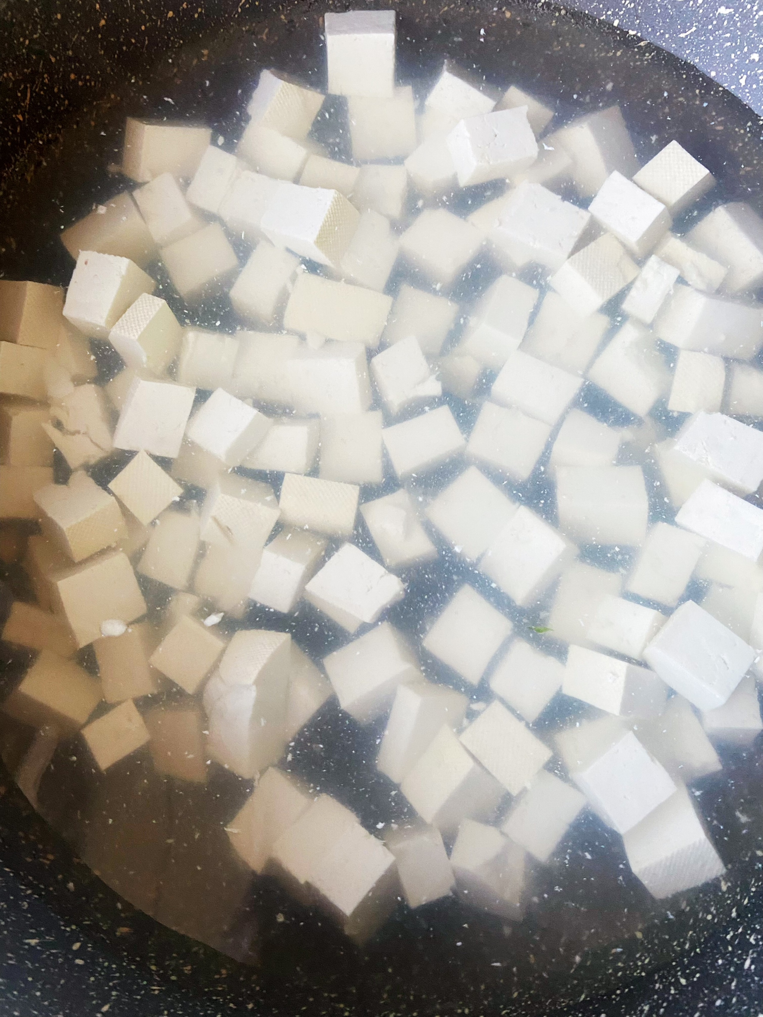放入豆腐块,炒匀后调小火,盖上锅盖,焖煮5分钟;