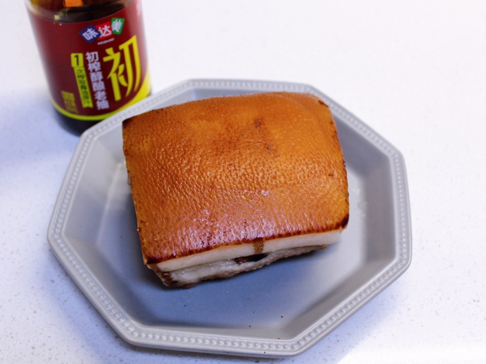 煮好的五花肉表皮朝上,涂抹味达美初榨醇酿老抽半勺,使表皮上色,稍微晾干;