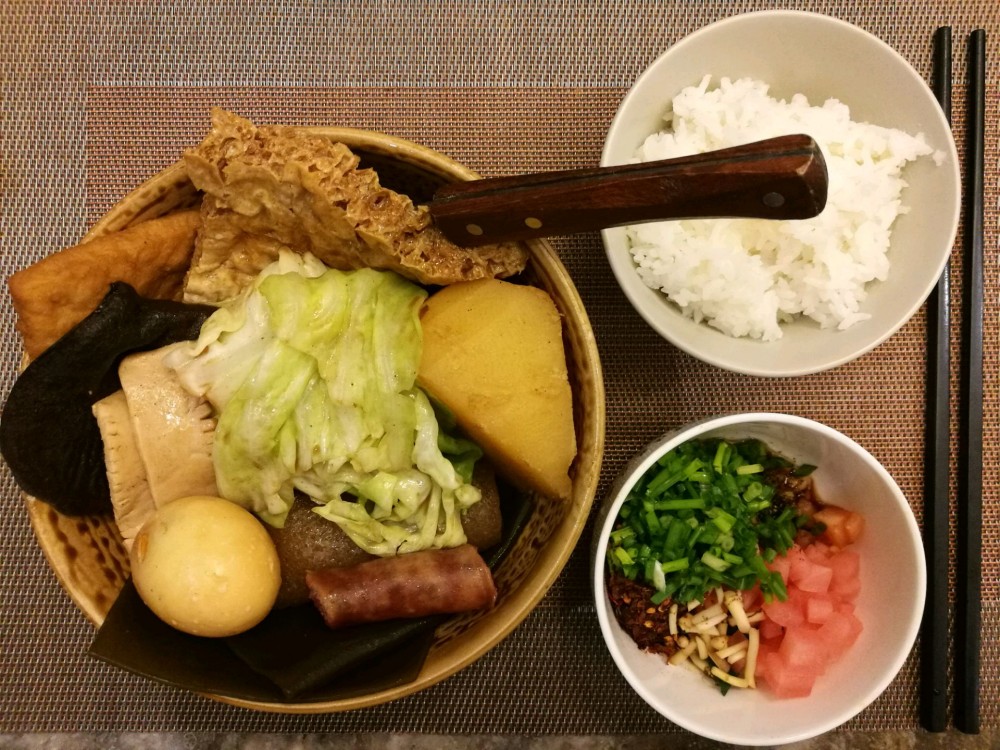 准备出锅:准备吃之前,卤汤再次煮沸几分钟让冷却的食材复热,下不耐煮的食材如蔬菜、炸丸子等,盛出。