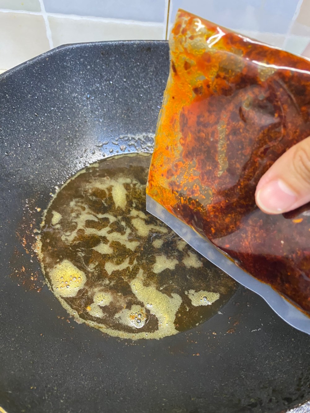 剩下的油、如果多了就盛一些出去 小火放入50克干锅料