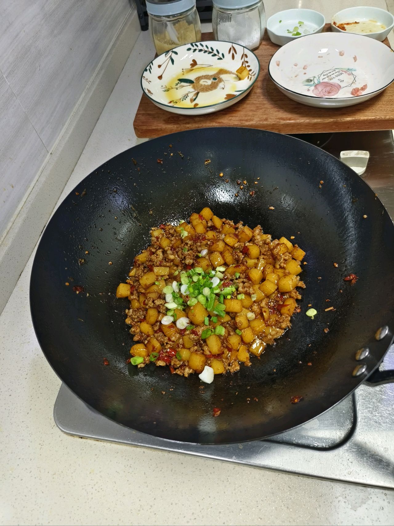 肉末炒散,放入辣椒酱(我的是自己腌制的酸辣椒,有姜蒜盐)