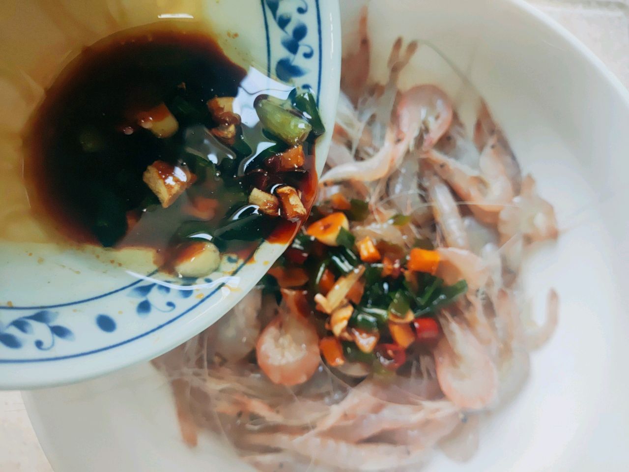 等料汁放凉,青虾再清洗一遍,,放一点小葱和一点点高度白酒在料汁,搅拌均匀