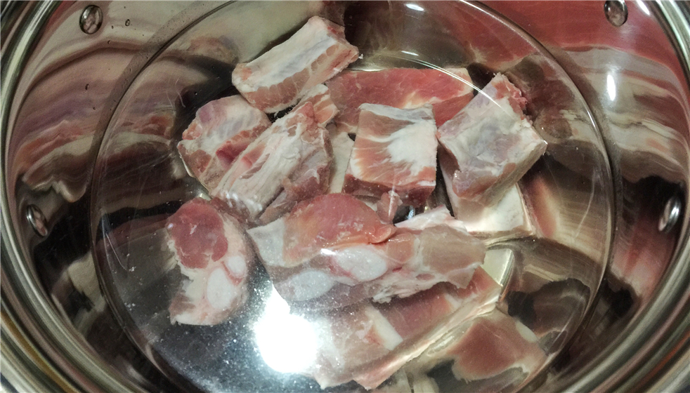 倒去水,排骨冲洗除去残留的浮沫,沥干。