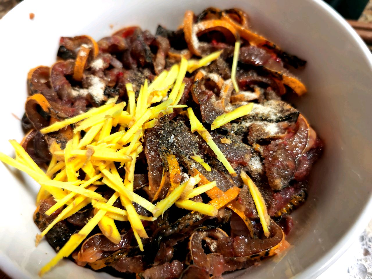 加入红薯淀粉水上浆,不要太稀也不能太干,太稀了出水多影响口感,太干了下锅容易粘