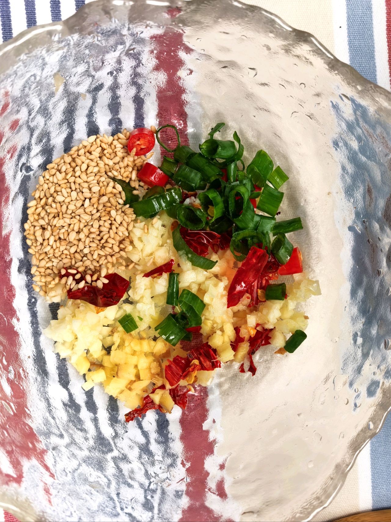 小葱、小米辣切圈,干辣椒切段,蒜、姜切末。
