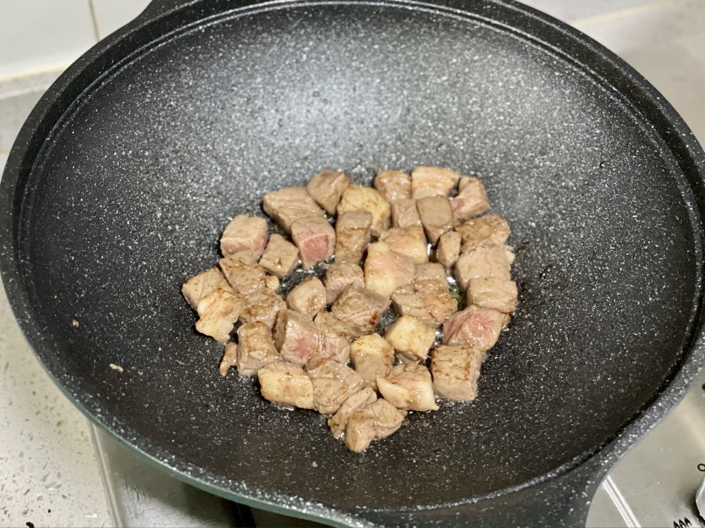 锅里热油,倒入牛肉粒快速翻炒至表面变色焦黄,盛出;