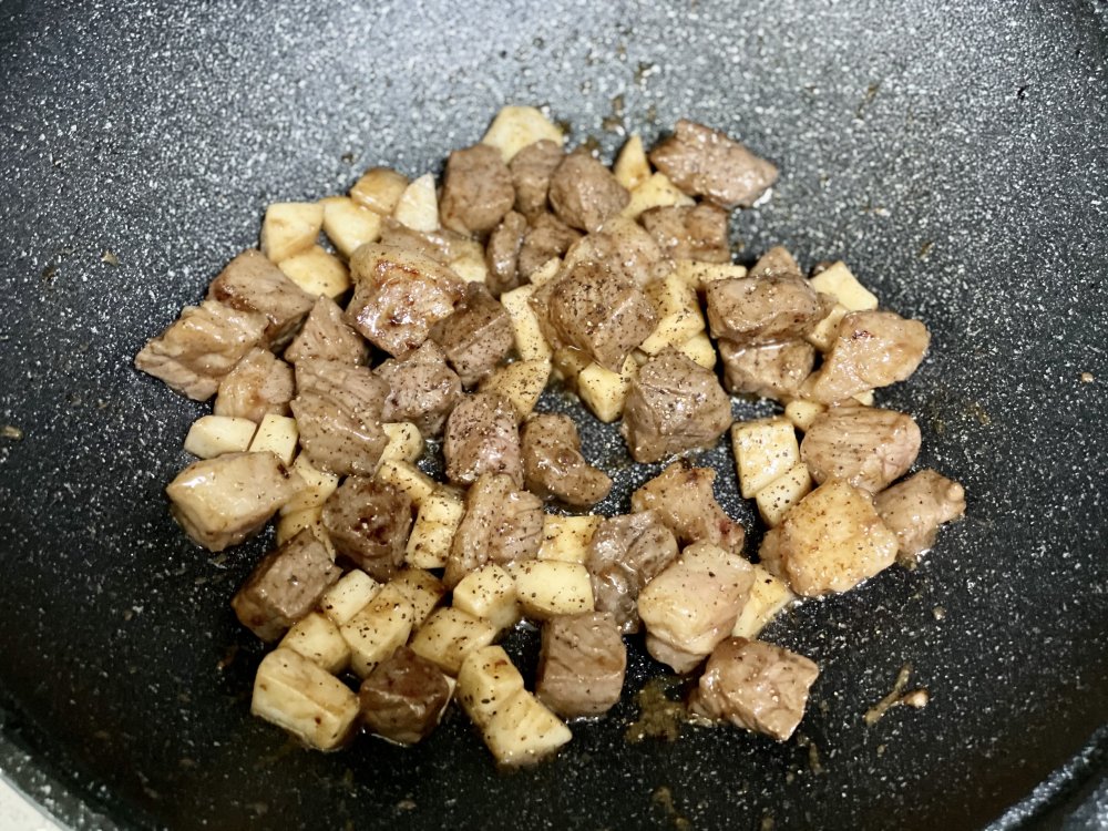 牛排切成丁,杏鲍菇洗净切丁(稍微大一点)