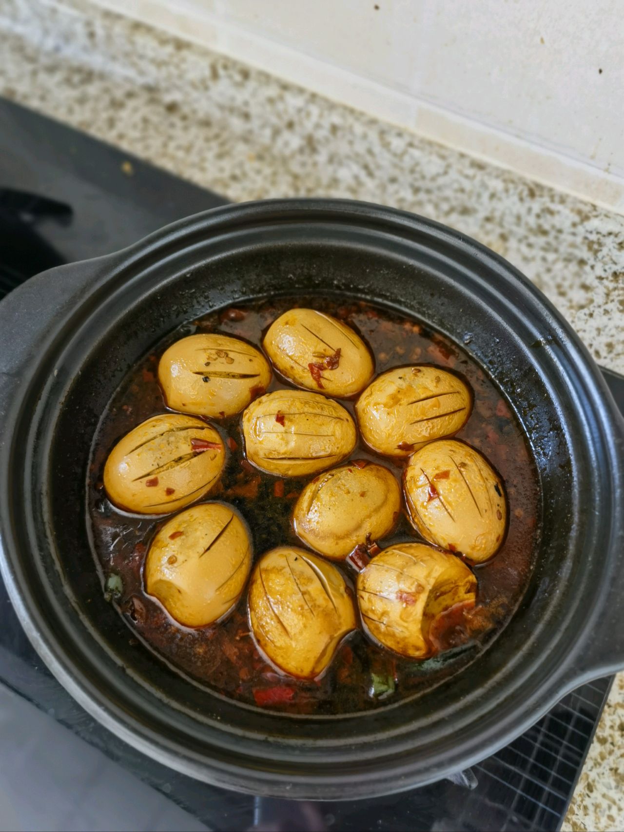 鸡蛋稍微改一下刀,这样容易入味,刀口开到蛋黄处就够了,太深容易煮烂。