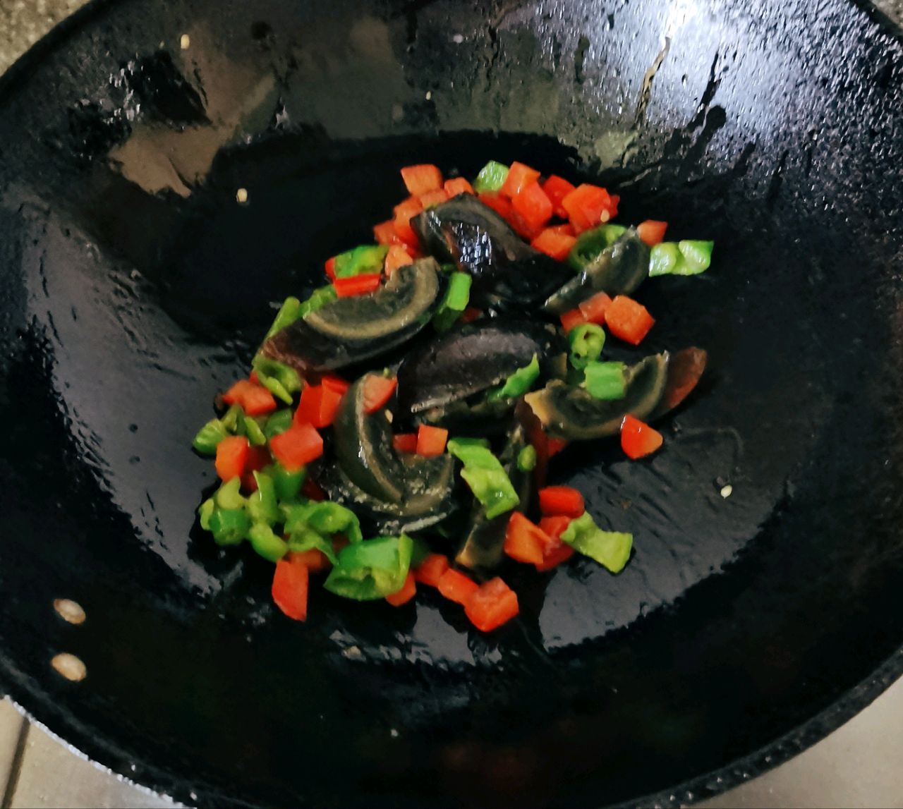 主料:皮蛋2个 尖椒1个 甜椒适量 香菜1棵