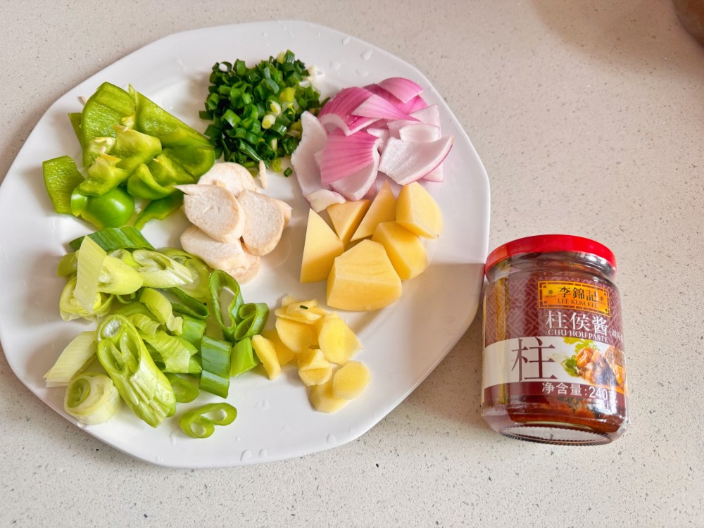 香葱切碎 大葱切段 姜切片 青椒,土豆,洋葱切滚刀块 杏鲍菇切片