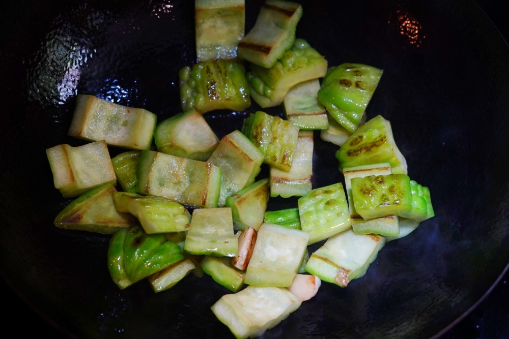 排骨煎好一面翻后翻面,再倒入姜、蒜、豆豉。姜、蒜、豆豉不要在一开始的时候就放,容易变焦