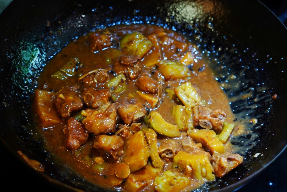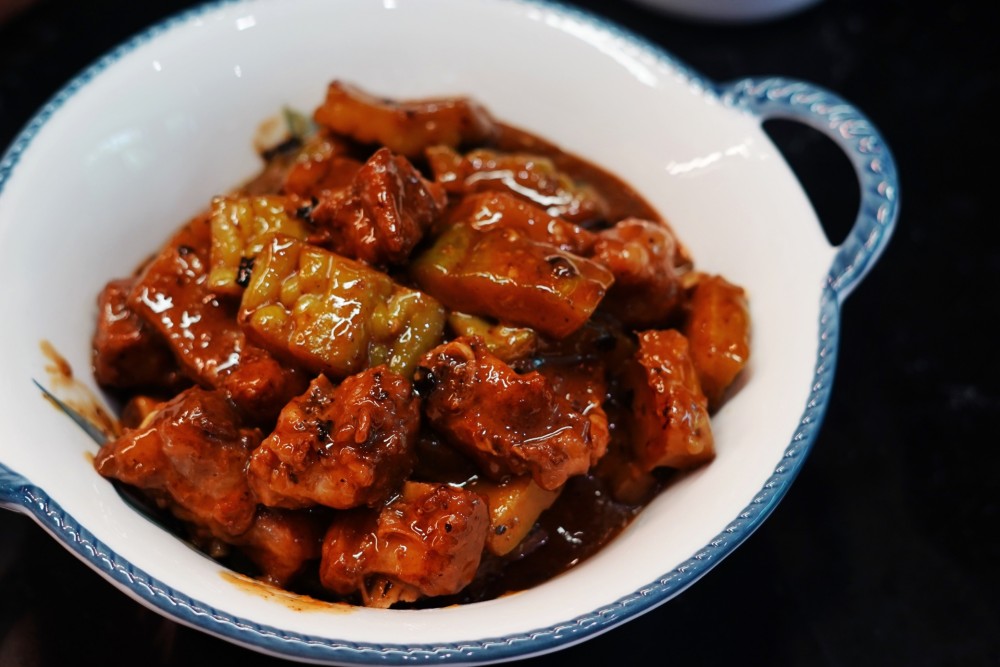洒入料酒,翻炒到酒被吸收,倒入开水末过排骨,加入老抽、酱油、糖,盖盖中小火焖。焖至水少了1/3,倒入苦瓜一起焖,焖到排骨苦瓜软,勾芡即可