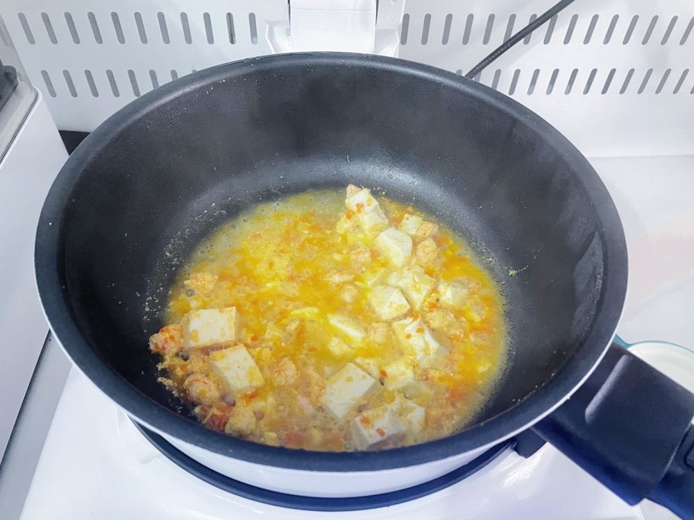 鲜到掉眉毛的蛋黄虾仁豆腐煲!鲜甜的虾仁,嫩滑的豆腐,超美味