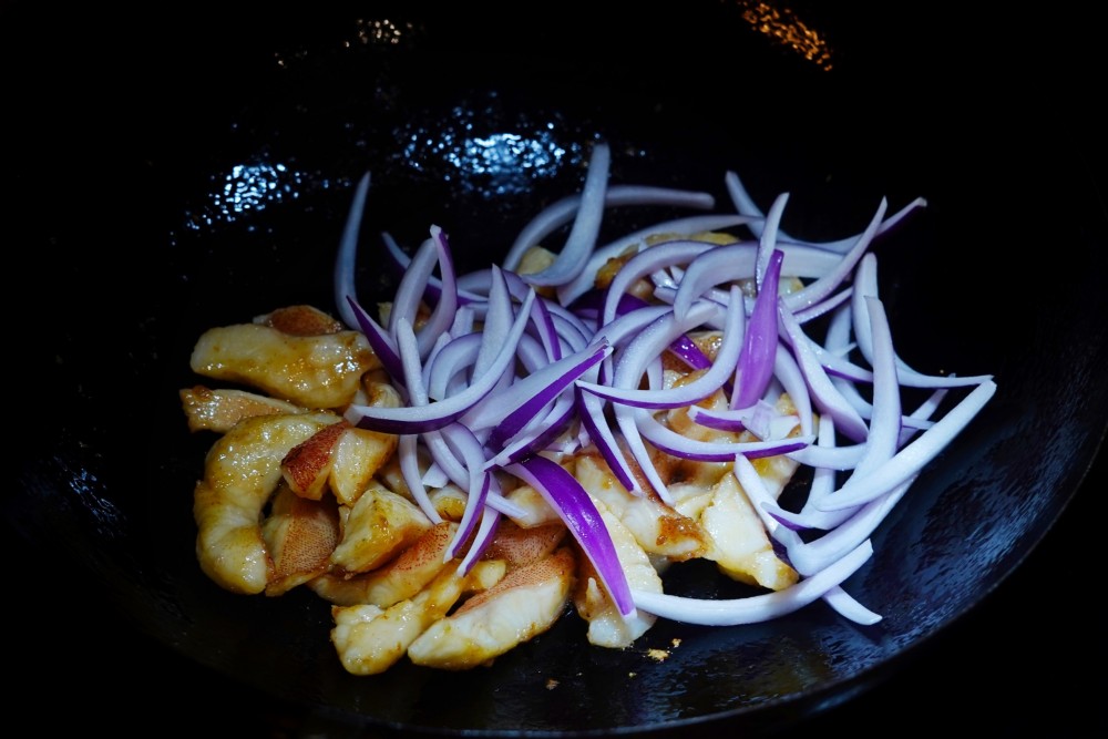 鱼骨剪成一段段,用盐抓匀,入冰箱冷冻保存,下次做其它菜式。鱼肉切成厚条,炒的时候不容易断或烂。用盐、白胡椒粉、少许酱油、料酒、红薯粉抓匀,最后加入油再次抓匀,腌半小时。洋葱切细条备用,胡萝卜和莴笋切薄片,焯水后备用,柠檬叶切成细丝备用(没有可忽略)