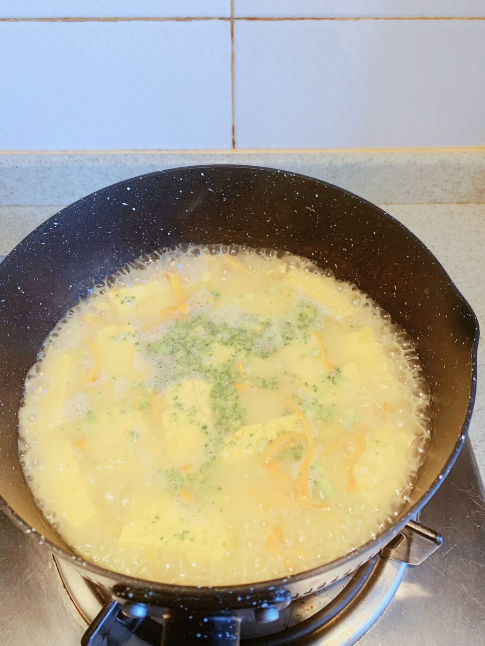 浓汤加虫草花、豆腐、西兰花煮片刻