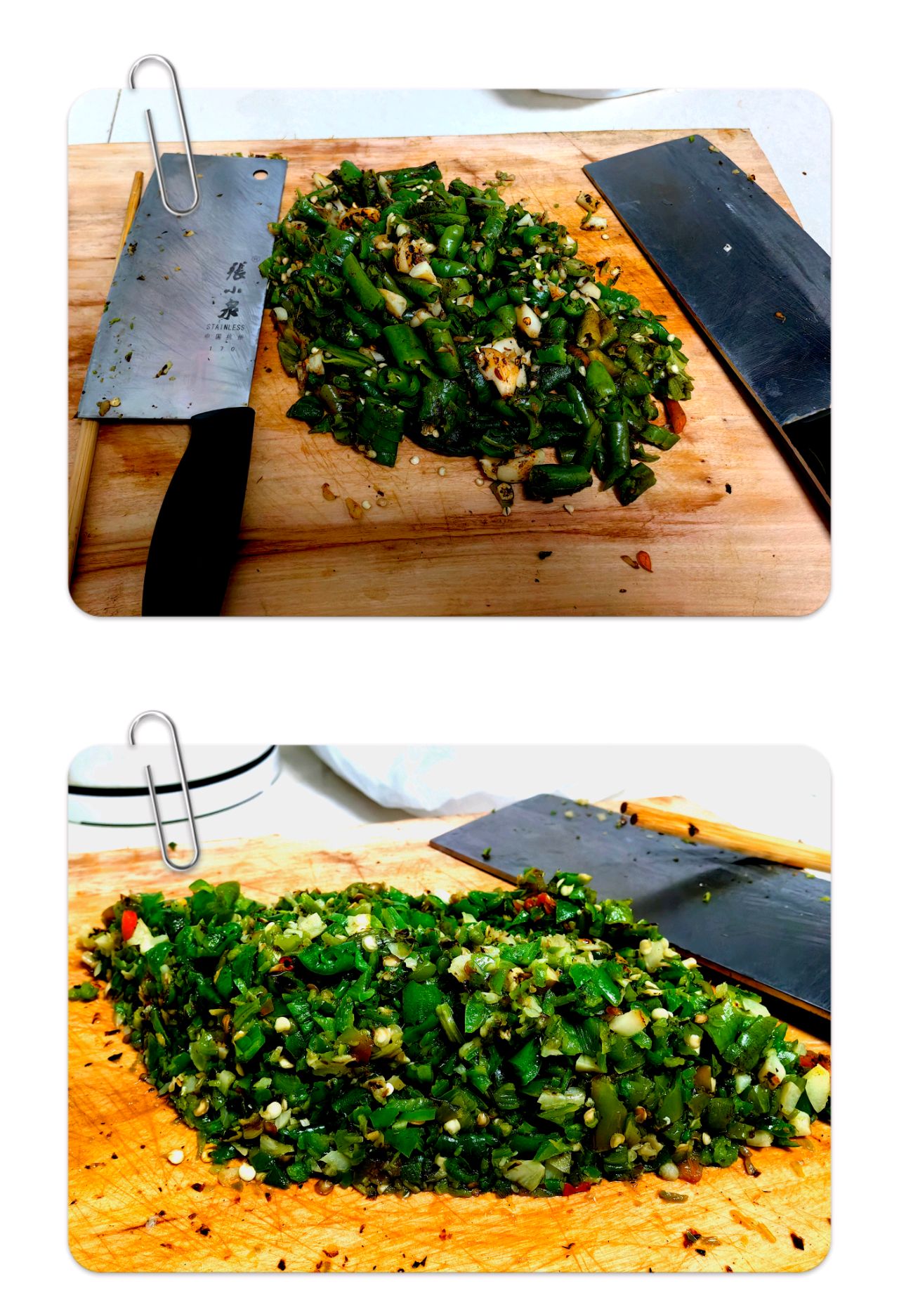 像这样摁着炒,直到辣椒和蒜变软了
