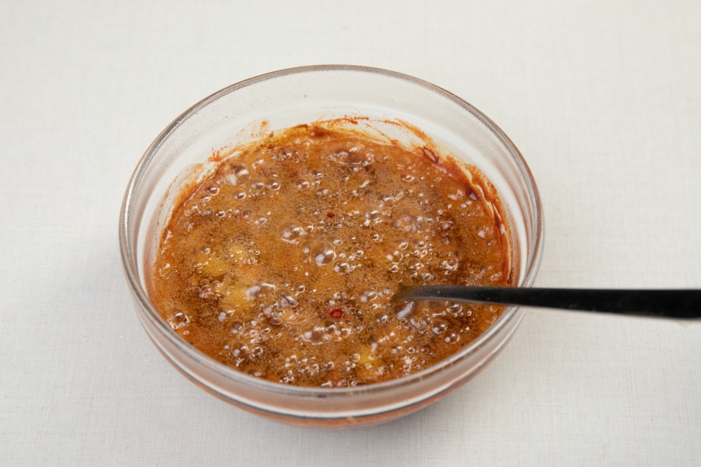 1、首先制作酱料,把酱料部分除植物油和藤椒油外的材料全部搅拌均匀。先放液体材料再放粉质的材料,拌匀后备用。