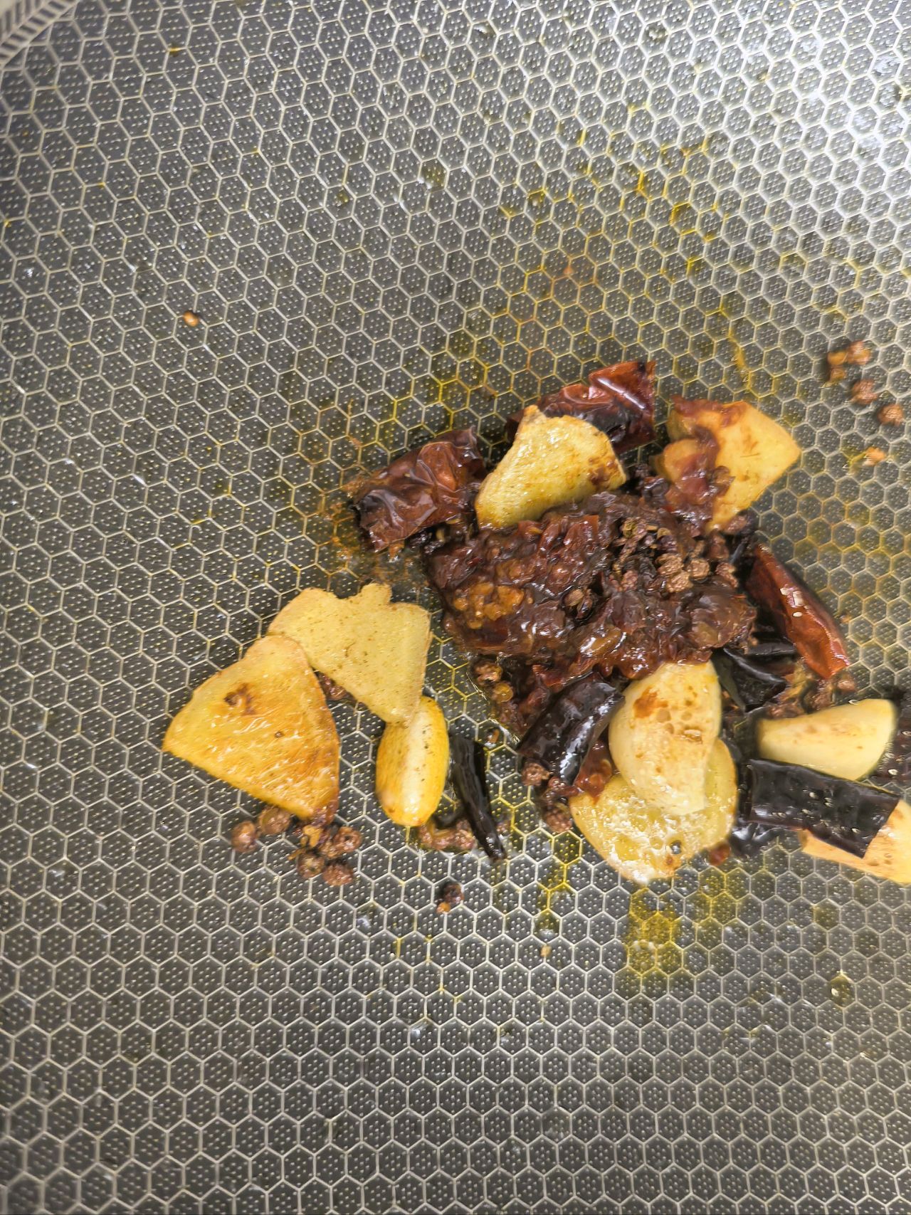 另起锅,热油爆香蒜、姜、干辣椒。