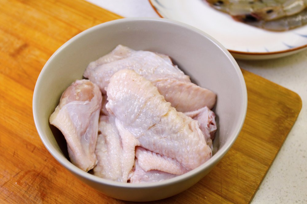 鸡翅切花刀,加盐、胡椒粉和料酒腌制去腥;