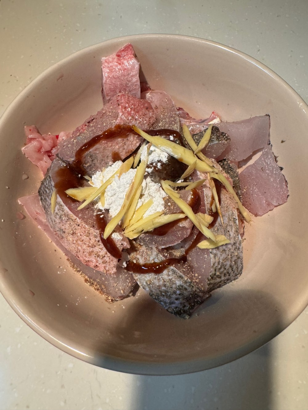 把鲈鱼切成条,加入蚝油,生抽,白胡椒,少许白砂糖,白酒,姜丝,抓匀,腌制