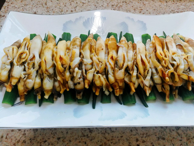秋葵冲洗干净,蛏子放入盐水中泡半个小时吐出泥沙。