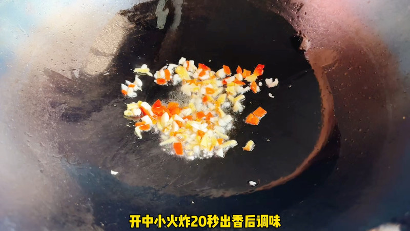 将大蒜沫、生姜、红辣椒炸香