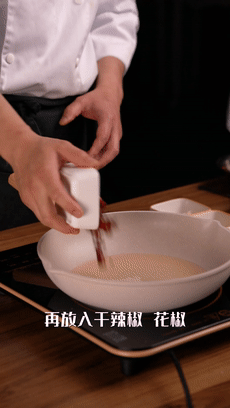 锅内放入色拉油烧至 180 摄氏度,放入干辣椒、花椒炒香后