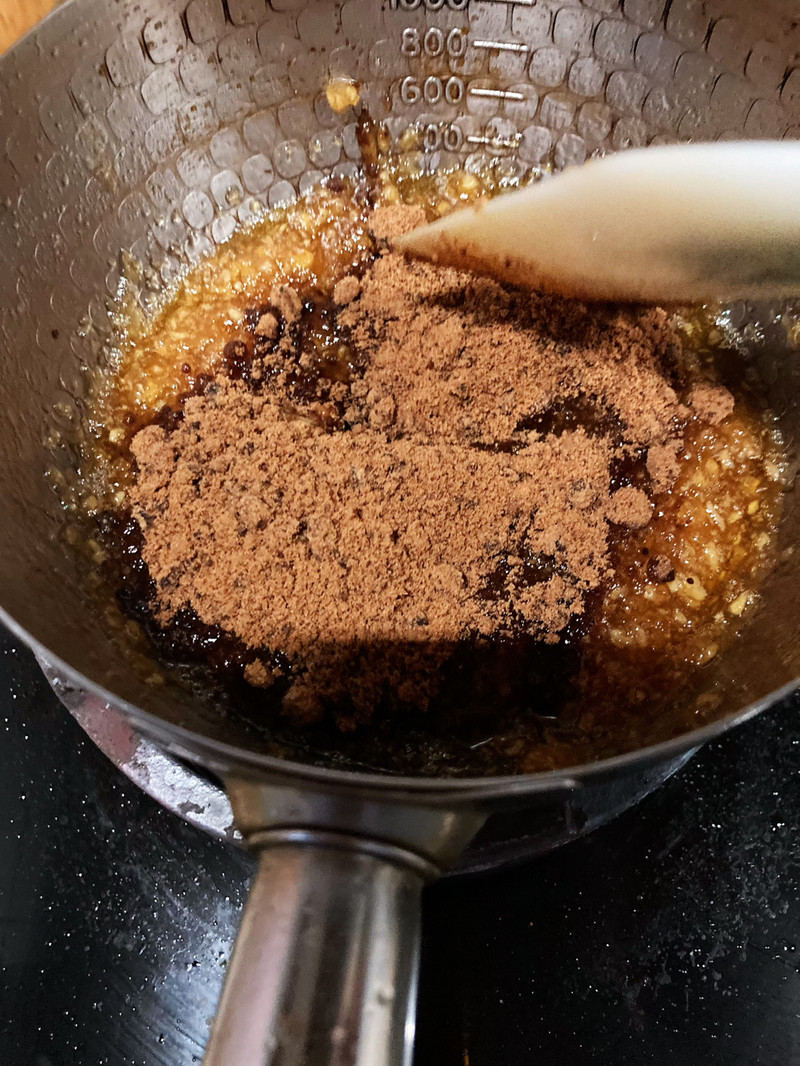 白糖被水打湿,开火慢慢熬出大气泡并变琥珀色就离火。切记在没有变琥珀色之前必要去搅拌,直到变色后可以离火搅拌。放入黄油融化混合。