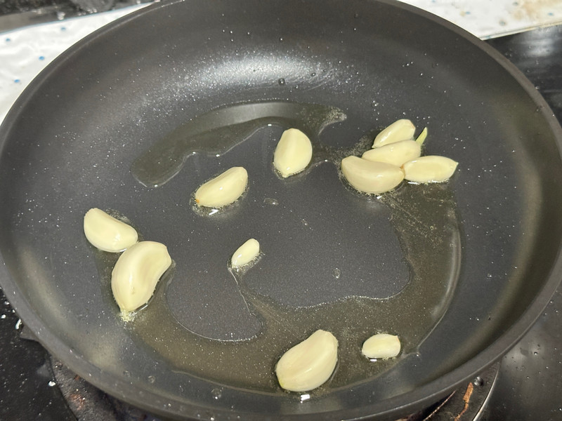 起锅烧油(炒菜量的食用油),油温六七成热的时候,加入麻油,再六七成热的时候,放入蒜炒香。